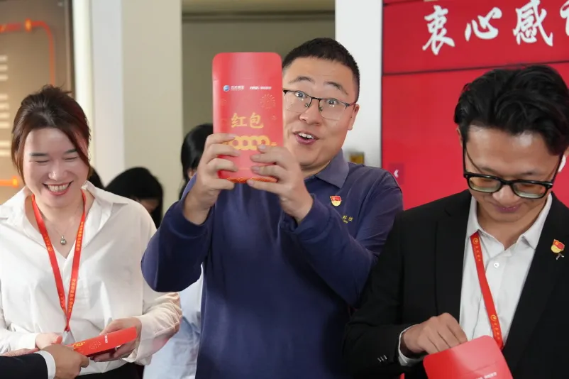 活动现场,一摞摞现金整齐码放成“现金墙”,红色背景板格外醒目。各部门员工依次上台,从公司领导手中接过沉甸甸的红包。现场掌声、欢呼声此起彼伏,不少员工掏出手机记录这一温馨时刻。